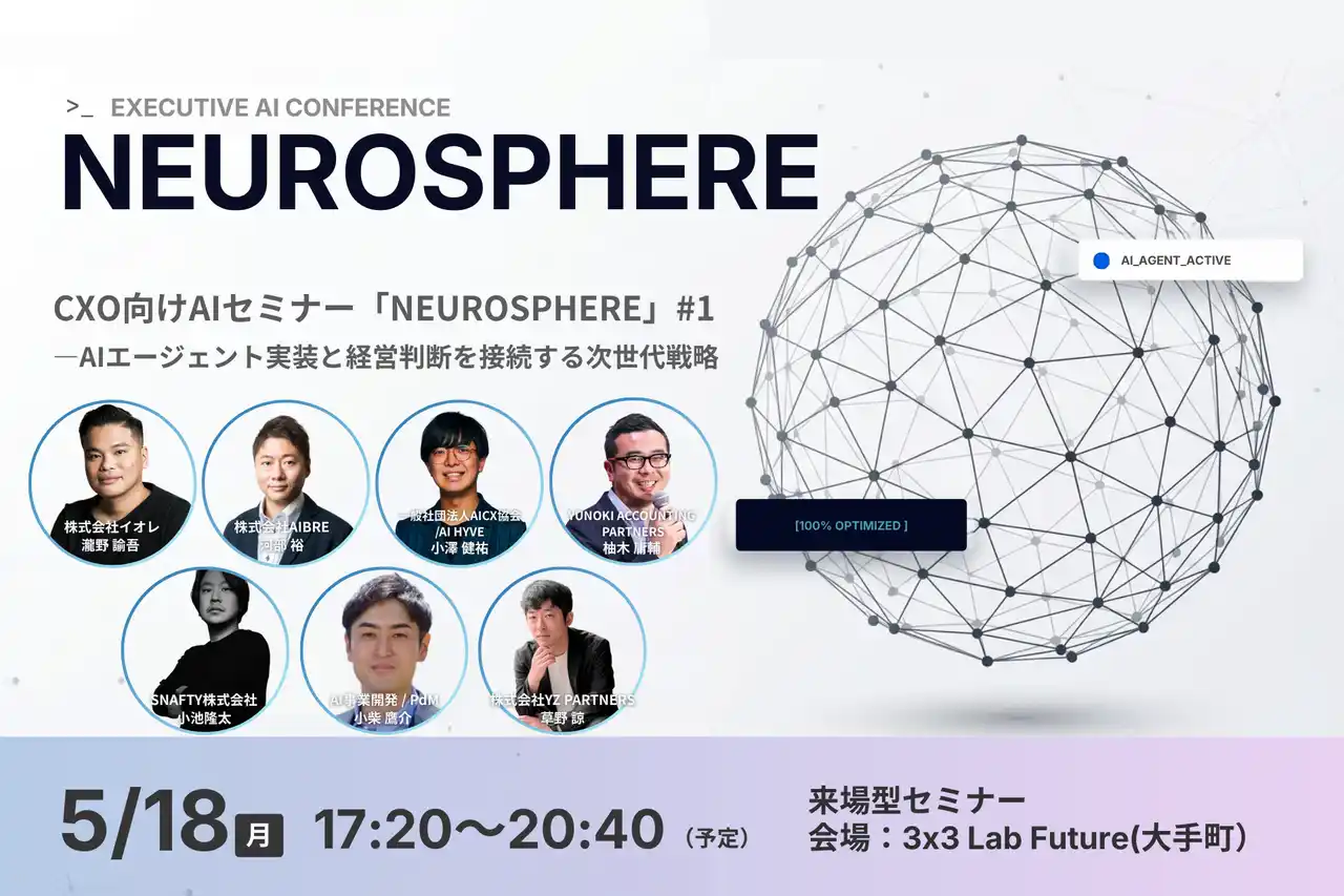 株式会社NEUROSPHEREは、2026年5月18日(月)、経営層・意思決定者を対象としたAI実装戦略カンファレンス「NEUROSPHERE」を大手町(3×3 Lab Future)にて開催いたします。 |