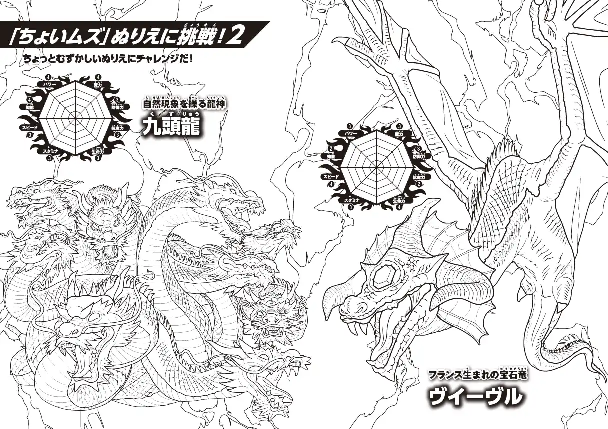 11.ドラゴン最強王図鑑 ぬりえ ちょいムズ メスター・ストゥアワーム VS ケツァルコアトル/九頭龍 VS ヴイーヴル |