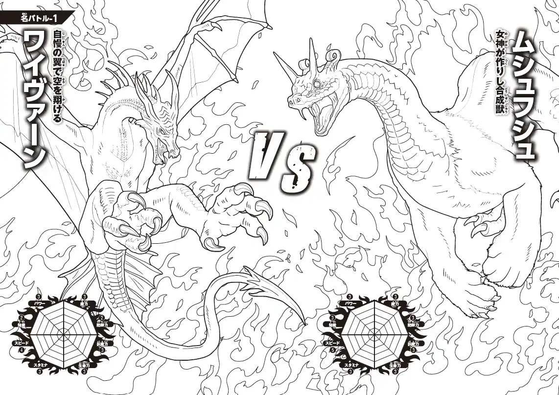 6.ドラゴン最強王図鑑 ぬりえ 名バトル6 ファイヤー・ドレイク VS アジ・ダハーカ |