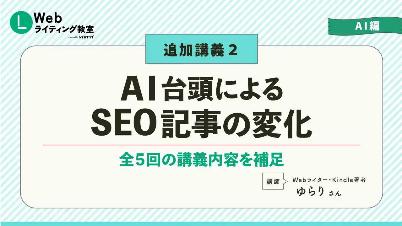 今回新たに追加されたのは、「AI時代が到来!Webライターはどうする?」「AI台頭によるSEO記事の変化」の2本の講義動画。昨今のAIの台頭によりWebライターの仕事内容が変化していく中、「正しく使えばAIはライターの脅威ではなく、ライターにとって優秀なアシスタントになる」という視点のもと、実践的なノウハウをお届けします。 |