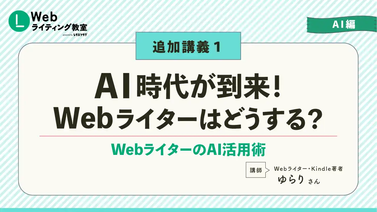 追加動画の講師を務めるのは、「レタスクラブ Webライティング教室」のメイン講師であり、ご自身も未経験からフリーライターとして独立し大活躍中のゆらりさんです。日々のライティング業務で実際にAIを活用しているゆらりさんが、AIの賢い使い方や、AI時代における「ライターの市場価値の高め方」をわかりやすく解説します。 |