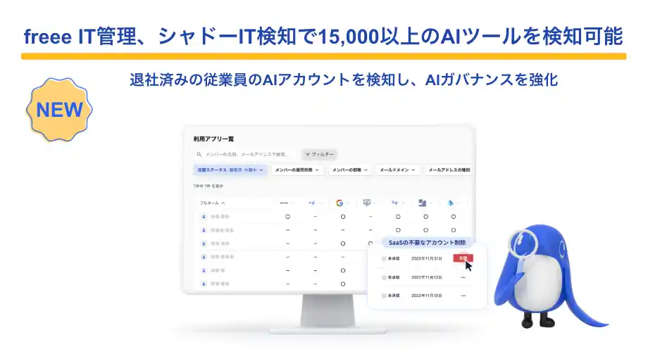 フリー株式会社(本社:東京都品川区、CEO:佐々木大輔、以下「freee」)は、SaaS管理・情報システム業務の効率化を支援する「freee IT管理」において、情報システム部門が把握していないITツール利用を指す「シャドーIT」の検知機能を大幅に拡張したことをお知らせします。本アップデートにより、15,000以上のAIツールの検知が可能となり、近年急増する「シャドーAI」リスクへの対策を強化します。 |