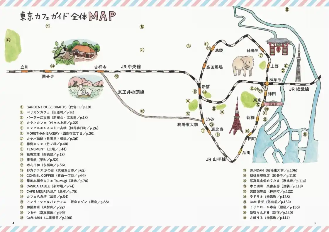 巻頭ページに大まかなカフェのロケーションがわかる全体MAPを、巻末に路線別のお店索引を付けたので、行きやすいエリアのカフェからどんどん足を運んでください。 |