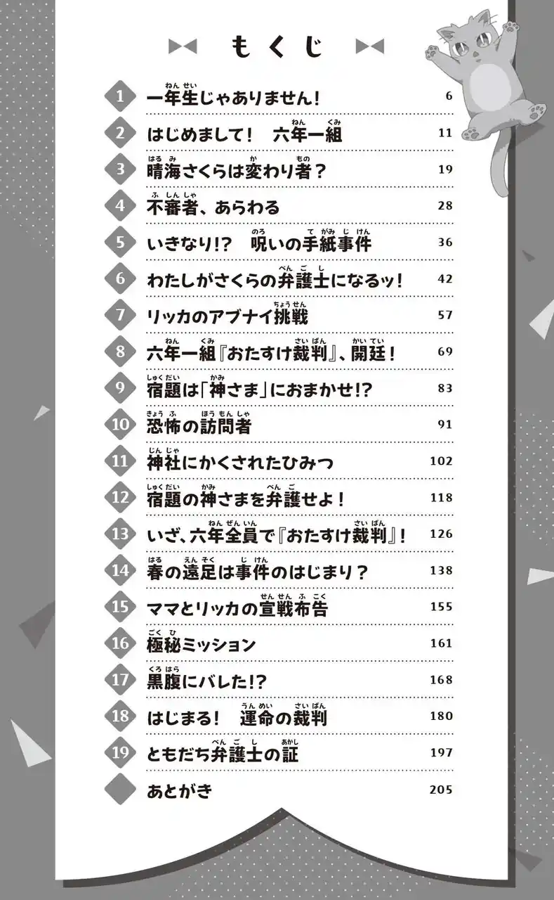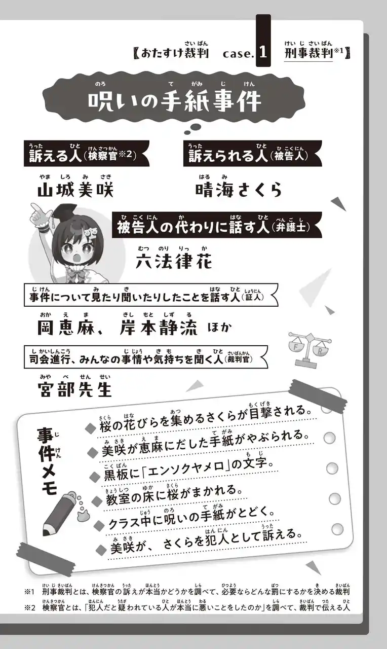 1年生にまちがえられちゃう「おちび」な6年生だけど、ナカミは法律の知識とあきらめないココロがつまってる。転校した学校でおこる事件だって、絶対見のがさない! 「呪いの手紙事件」に、「宿題の神様事件」。犯人だと疑われてる子たち、ホントにそうなのか!? モヤモヤしているのにだまっているのは、もうイヤなんだ。 真相をあきらかにするため、やろうよ、「おたすけ裁判」!! もちろんわたしが、こまってる子の弁護士になるから――! |