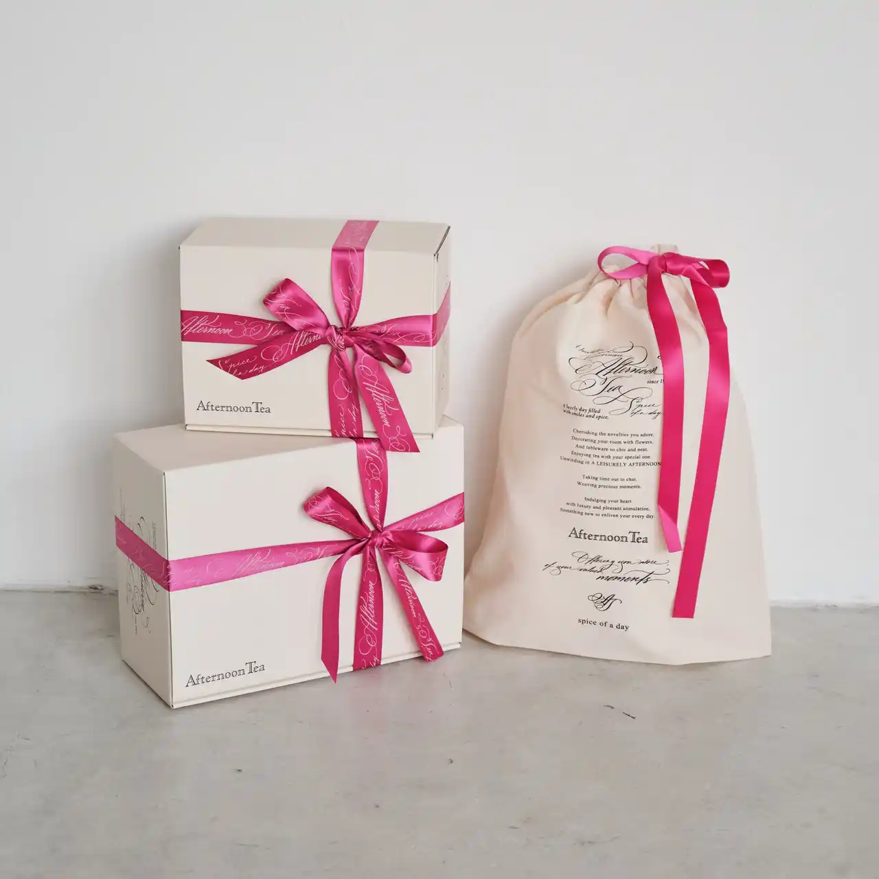 4月8日(水)より、有料ギフトラッピングに限定のピンクが登場。ギフトボックスとコットン巾着(Mサイズ)のリボンカラーとしてお選びいただけます。 |