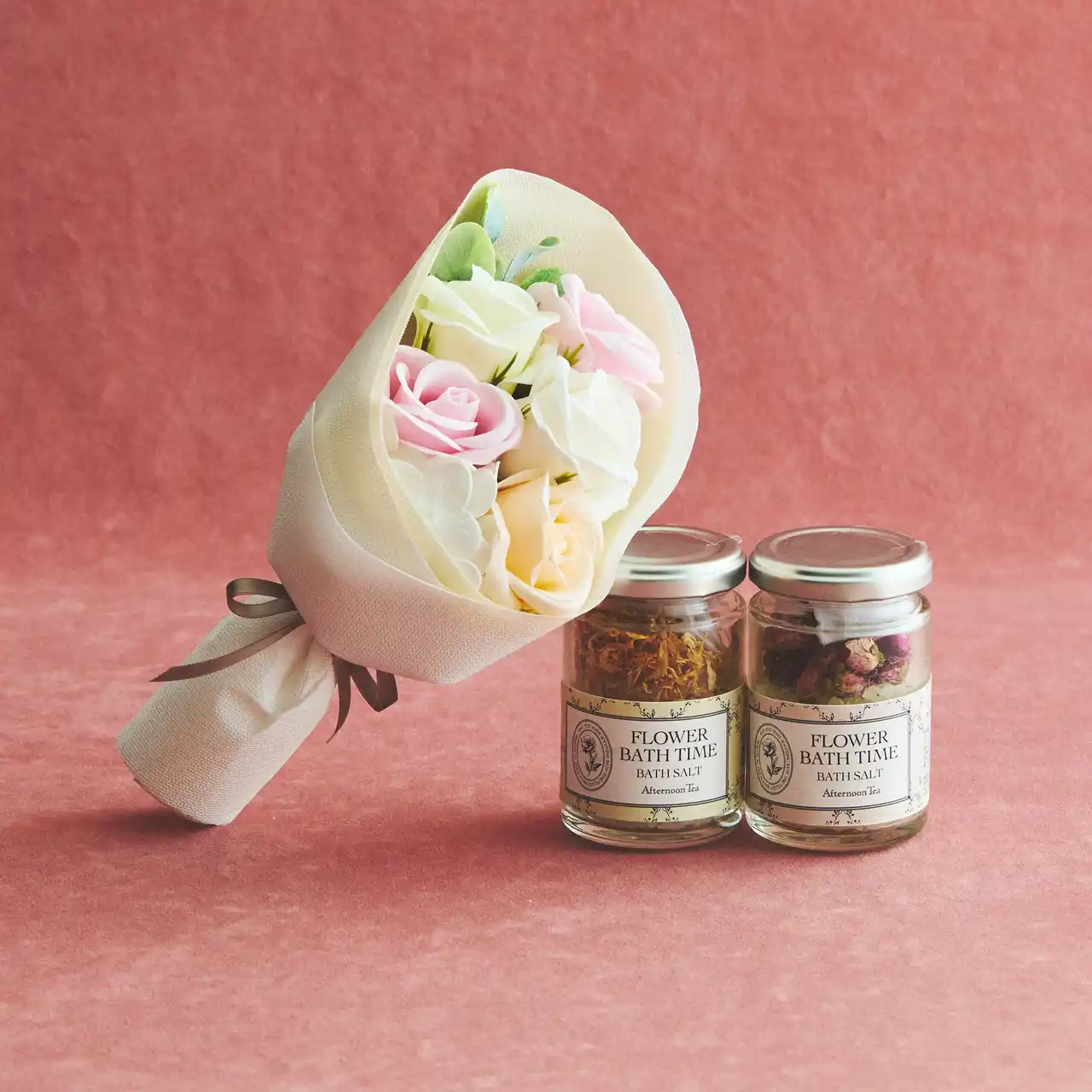フラワーブーケ ¥3,300、 ハーバルバスソルト 各¥1,760 |