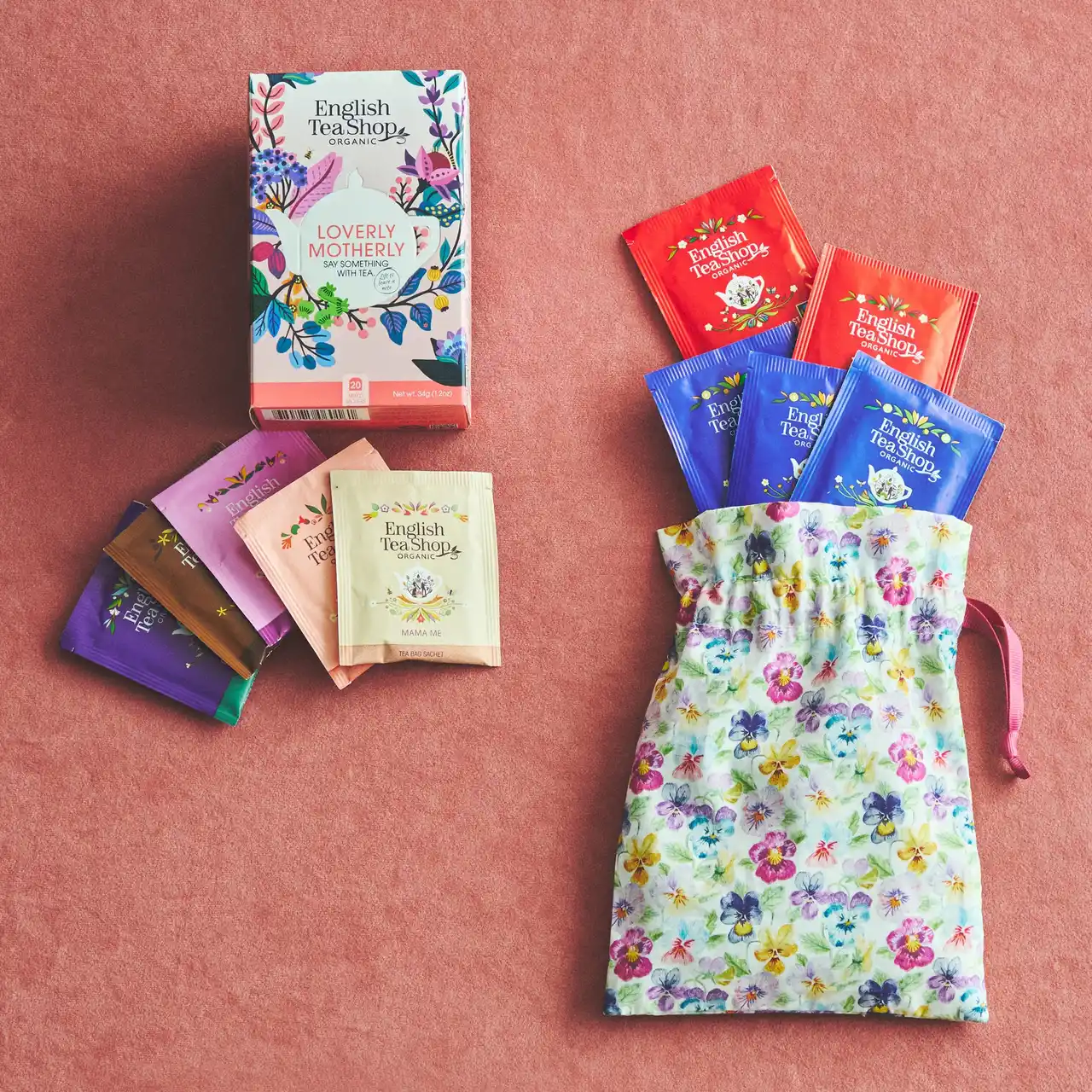 紅茶5種セット ¥1,080、LIBERTYプリント巾着入り紅茶セット ¥1,620 |