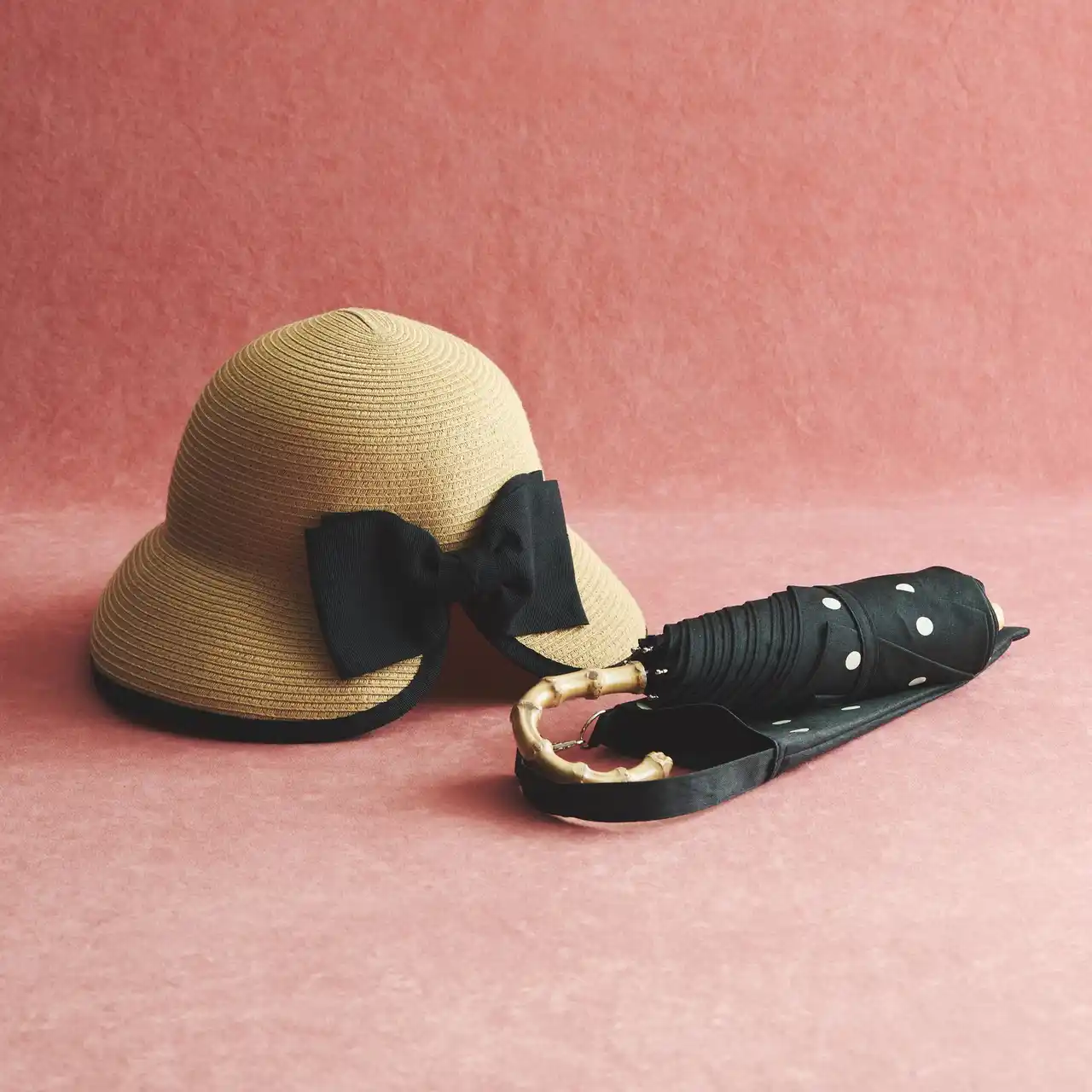 バックリボンハット ¥4,290、晴雨兼用折りたたみ傘 ¥4,620 |