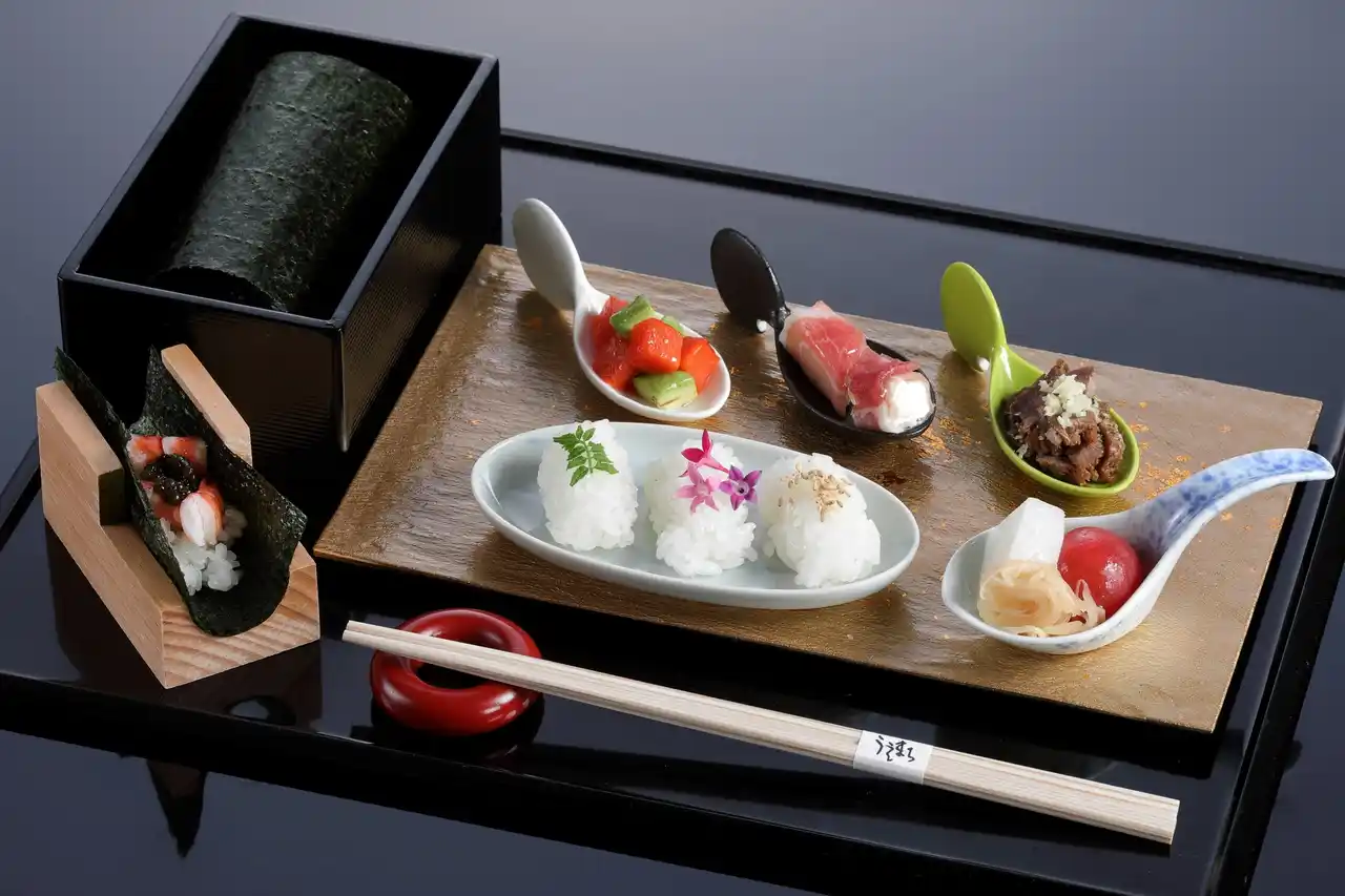 日本料理 うえまち料理長 茅ヶ迫 正治が手掛ける甘酒とマンゴーのゼリーやパティシエが手掛けるあじさいを模したスイーツなど、和と洋を融合した新感覚のスイーツを、ホテルの外観をモチーフにしたオリジナルのアフタヌーンティースタンドに盛り付け、各日20名様限定でご用意します。生ハムとクリームチーズ、海老とキャビアなど、創作手巻き寿司もご一緒にお楽しみください。 |