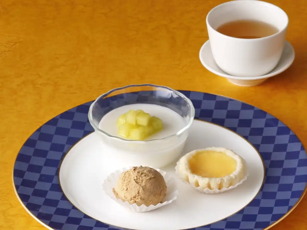 もちろん「アフタヌーンティー」に欠かせないスイーツもご用意しています。中国料理「大観苑」で長年、多くの食通たちから愛されてきた王道の品々をラインアップした一皿は、大満足の締めくくりになること間違いなし。メロンの甘みとさっぱりとした杏仁の香りの調和が根強い人気の「杏仁プリン」や、濃厚な胡麻の味わいともちもち食感を愉しむ「胡麻あんきな粉もち」など、それぞれに個性が際立ち、中国茶とも相性抜群です。 |