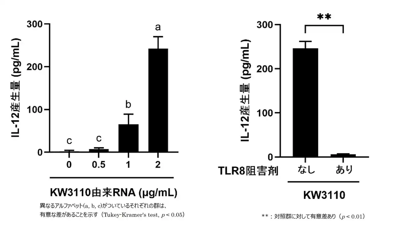 図3. 乳酸菌L. パラカゼイ KW3110由来RNAとTLR8のIL-12産生誘導への関与 |
