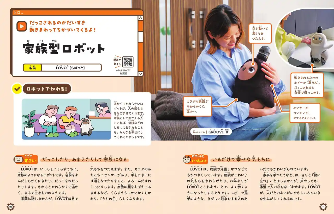 小学生向けの学校図書館図書『ロボットでかわる!みんなのくらし ロボットとともだち』に『LOVOT』が掲載されています。くらしの中で活躍するさまざまなロボットを紹介する本書の中で、『LOVOT』は「家族型ロボット」として取り上げられています。だっこしたり、あまえたりして家族になること、人の気持ちをなごませること、病院や介護施設でも活躍していることなどが紹介されています。 |
