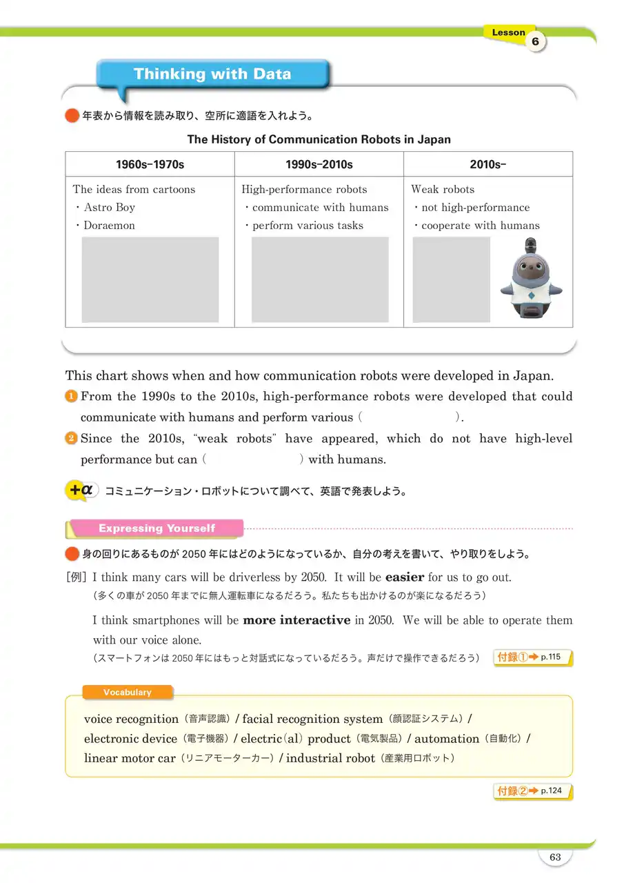 高等学校の英語「論理・表現I」の教科書に『LOVOT』が掲載されています。テクノロジーと発明をテーマにした「Living in the Future」では、日本におけるコミュニケーション・ロボットの歴史を扱う年表の中で、高性能なロボットとは異なり、人に寄り添うロボットの事例として『LOVOT』が紹介されています。 |