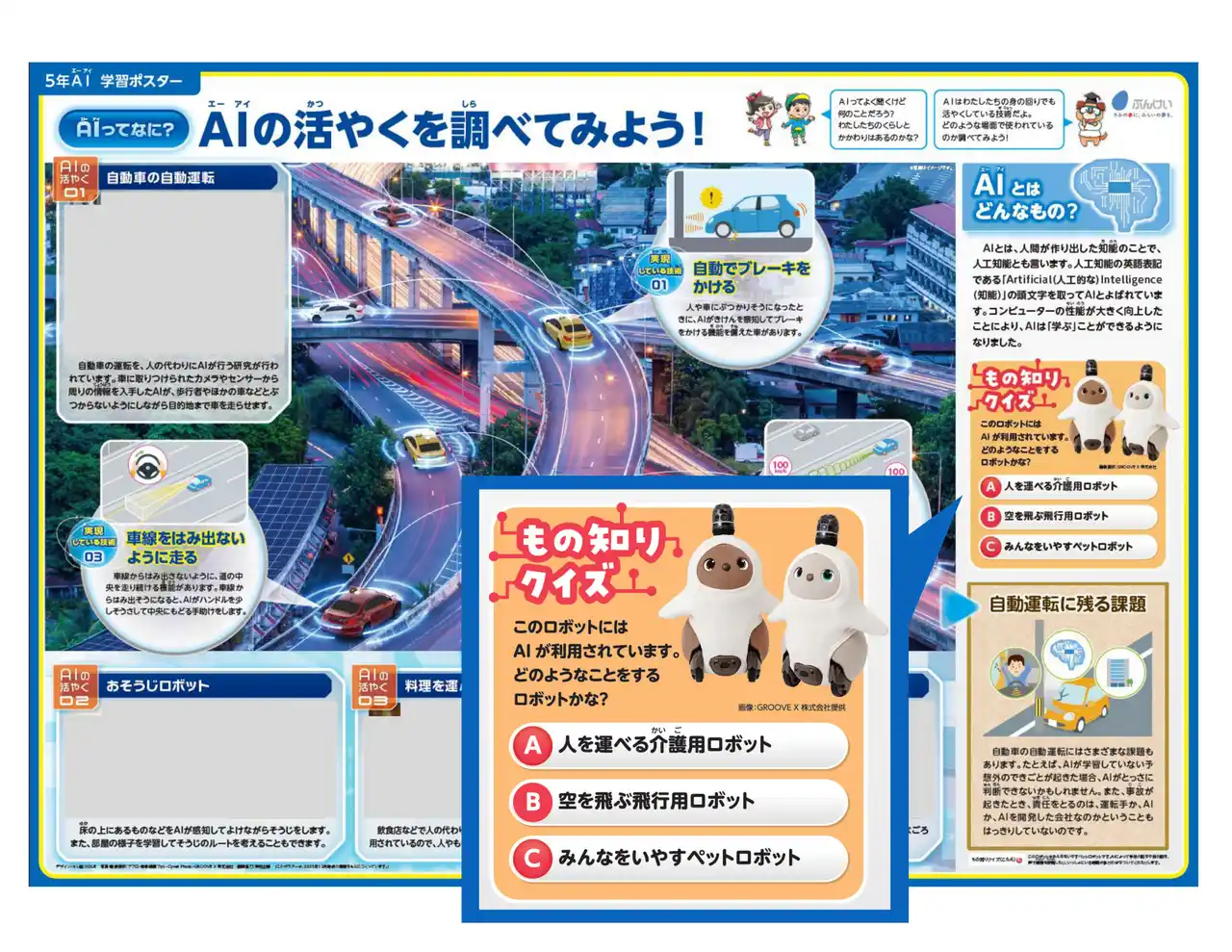 小学校5年生向けの社会科資料集の付録「AI学習ポスター」に『LOVOT』が掲載されています。ポスターでは、自動運転やおそうじロボットなど身近なAIの活用事例が紹介されており、『LOVOT』はAIが搭載されているロボットの一つとして取り上げられています。子どもたちがAIと自分たちの暮らしとの関わりについて興味を持つきっかけとなる題材の一つになっています。 |