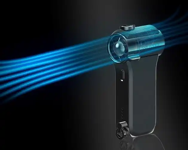 本体重量がわずか約130gの軽量且つ片手に収まるコンパクトなスマートフォンサイズ。高性能ブラシレスモーター搭載の羽隠し設計で、ストレートで強力な直線風を生み出します。風量調節レバーは片手で操作が可能。また、自立可能な設計で卓上においても使用いただけます。 |