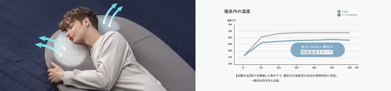 通気性に優れた本体と、さらっとした風合いと抜群の吸水拡散性に優れたレーヨン混素材のカバーの相乗効果でさらに蒸れ感を軽減。朝まで最適に温度・湿度をコントロールします。一般的なウレタン素材の抱き枕は通気性が悪く湿気や熱が溜まりやすいですが、「ボディピロー」は90%以上が空気でできているためダニやカビが発生しにくく清潔で、中材までシャワーで水洗い可能です。 |