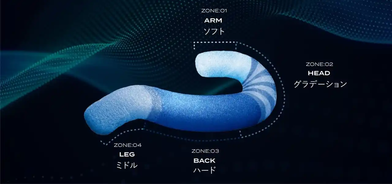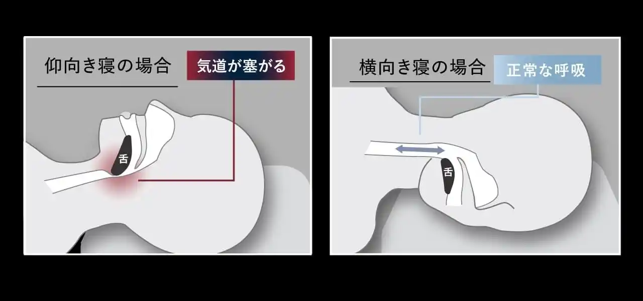いびきの仕組みは、仰向けで寝ることで舌が喉の奥に沈み、気道を防ぐことが原因です。横向きで寝ることで、舌の落ち込みを防ぎ気道を確保します。「ボディピロー」は軽症のSASと診断された場合の体位治療として、寝姿勢を矯正するアイテムです。体位治療とは、仰向けで寝るといびきや無呼吸が発生する場合に、横向きで寝ることにより症状が軽減する治療法です。睡眠専門医で太田睡眠科学センター所長である、千葉伸太郎医師監修のもと設計した4ゾーン5レイヤー構造で、自然な横向き寝をサポートします。 |