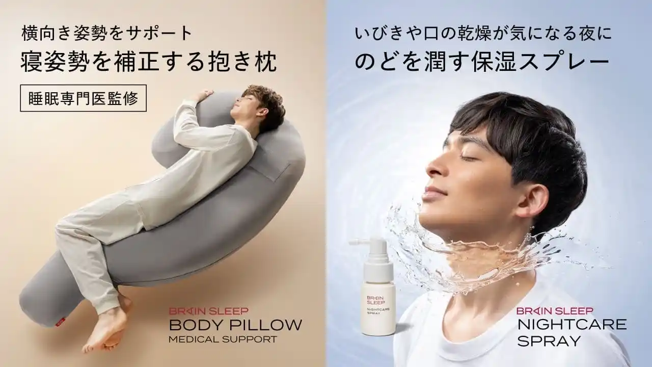 株式会社ブレインスリープ(本社:東京都千代田区、代表取締役:廣田 敦、以下「ブレインスリープ」)は、睡眠時のいびき対策としていびきによるのどの乾燥をケアする「ブレインスリープ ナイトケア スプレー(以下、「ナイトケア スプレー」)」と、いびきを軽減する横向き寝姿勢をサポートする睡眠専門医監修の抱き枕「ブレインスリープ ボディピロー メディカル サポート(以下、「ボディピロー」)」を4月8日(水)11時よりブレインスリープ