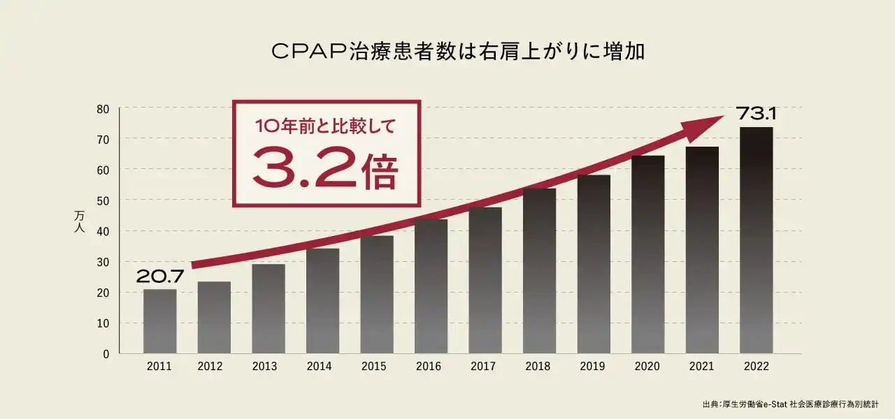SASとは、睡眠中に10秒以上呼吸が止まる「無呼吸」や弱い呼吸「低呼吸」が多く発生する睡眠障害です。呼吸が停止する状態が繰り返し発生することで血液中の酸素濃度が低下し、様々な症状や合併症を引き起こす恐れがある疾患です。10秒間以上呼吸が停止する状態が、1時間あたり5回以上あれば、SASと診断されます。日本におけるSASの潜在患者数は2,200万人、治療が必要な患者数は940万人と推定され、年々増加傾向にあります。※2 また、SASの治療法として一般的とされるCPAP※3を用いた治療を行っている患者数は、10年間で3.2倍に増加しています。※4 SASは糖尿病・高血圧・脳血管疾患など様々な合併症を引き起こし、中等症以上で未治療の場合8年後の死亡リスクが40%近くもある恐ろしい疾患です。※5 |