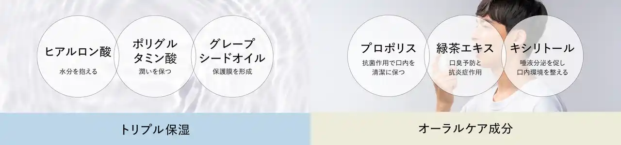 1. MOIST & ORAL CARE うるおい&口腔ケア成分が睡眠中の口の中を守る いびきや口呼吸によって、睡眠中ののどや口の中は乾燥しやすい状態です。この乾燥はいびきを悪化させ、睡眠の質の低下を招きます。睡眠中は、唾液の分泌量が通常より減少するため口の中が乾燥しやすい状態です。計6種のうるおい成分とオーラルケア成分で、乾燥感を和らげ口内環境を整えます。朝の不快な口臭やネバつきを防ぎ、すっきりとした目覚めをサポートします。 |
