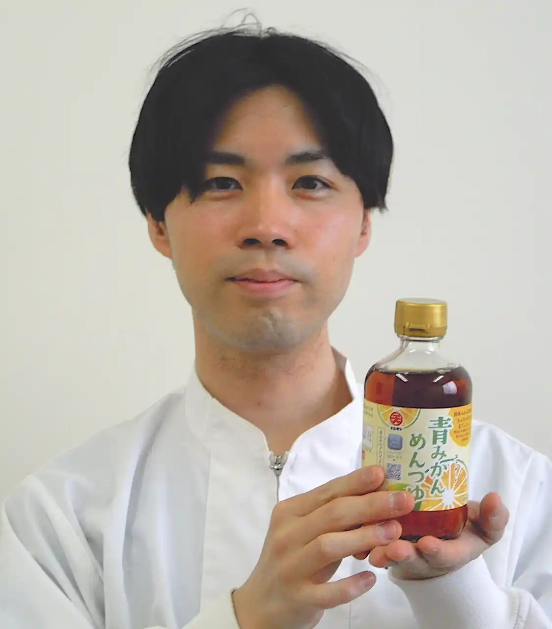 今回の「青みかんめんつゆストレート」は、2022年に開発した「瀬戸内柑橘めんつゆ」が原点になっています。当時は愛媛県産の柑橘「せとか」を使っていたのですが、せとか不作の影響で原料の確保が難しくなり、商品として継続することができませんでした。せっかく世に出した商品だったので、そのまま終わらせてしまうことに対しては、開発者として引っかかるものがありました。柑橘めんつゆというジャンル自体には手応えを感じていたので、「別の素材でもう一度つくれないか」と考え、代わりになる柑橘を探し続けていました。そうした中で出会ったのが、静岡県三ヶ日で栽培されている「摘果青みかん」です。 |