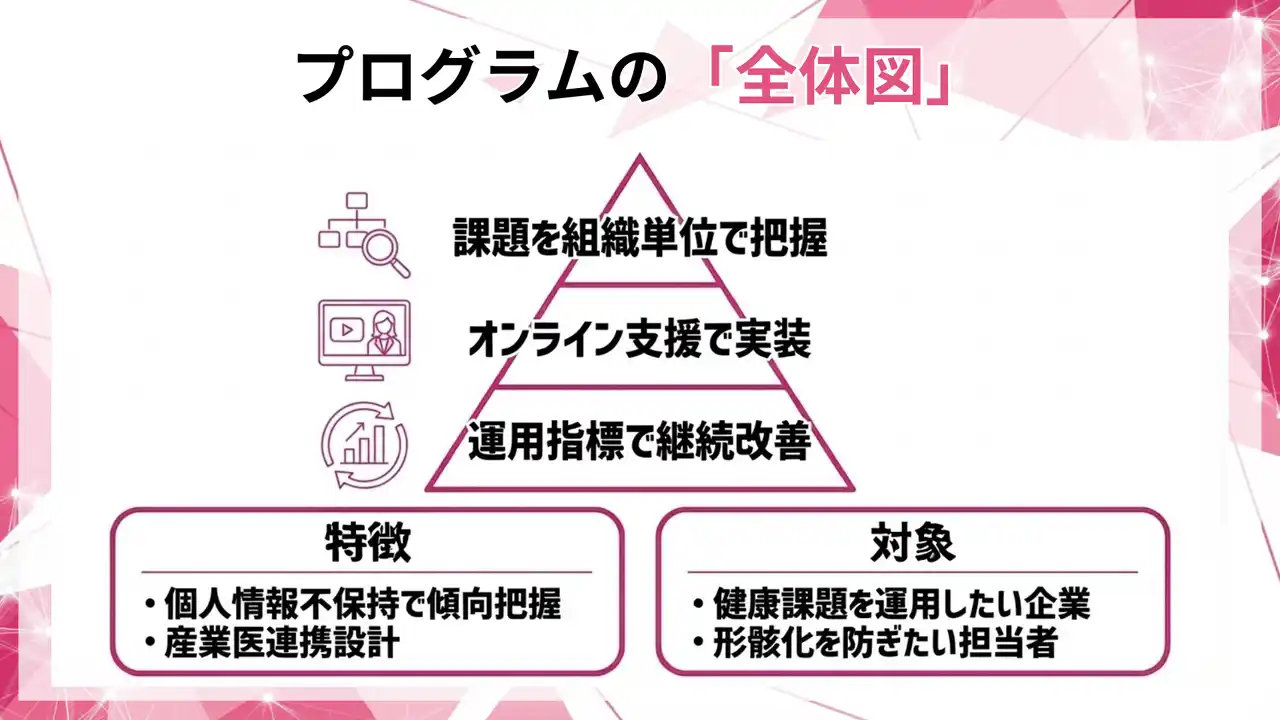 重要事項 本プログラムは医療行為(診断・治療)を提供するものではありません。当社は個人情報を保持しない前提で運用し、個人を特定しない形で組織単位の傾向把握と支援提供を行います。 |