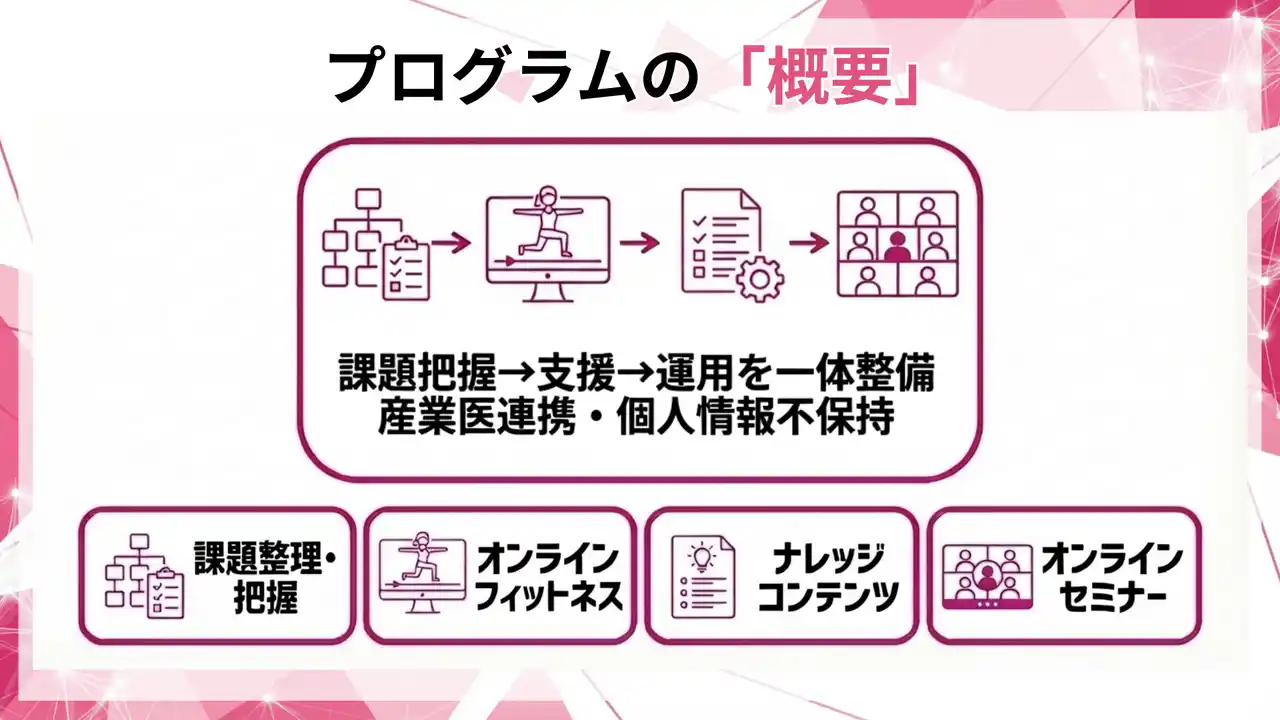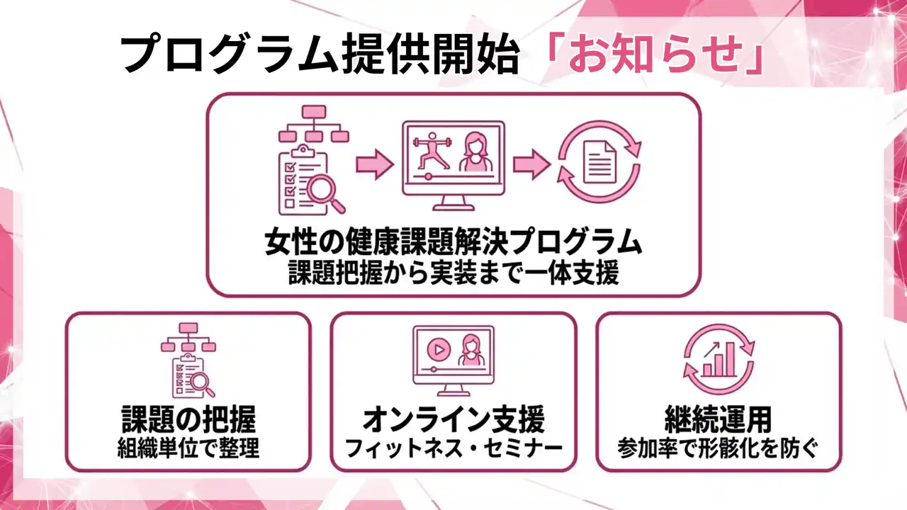 本プログラムは、女性の健康課題を産業医・保健師等と連携して整理し、当社が個人情報を保持しない運用のまま、オンラインフィットネス、ナレッジコンテンツ、オンラインセミナーを組み合わせて支援する実装型のプログラムです。 |
