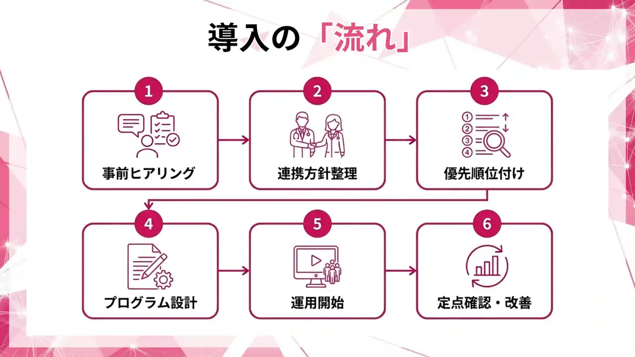 初回の情報交換では、課題整理の観点、優先順位付け、提供メニューの組み合わせ例、運用設計(周知・参加導線・継続設計)のたたき台まで提示します。 |