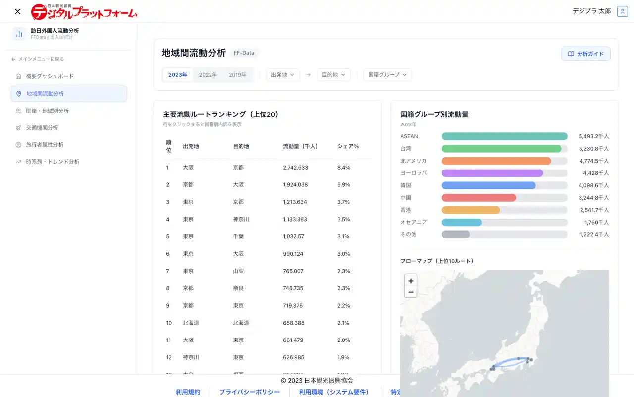 『訪日外国人流動分析』は、訪日外国人の移動・流動に関する統計データを6つの分析ビューで可視化するダッシュボード機能です。デジプラ上で提供しています。 |