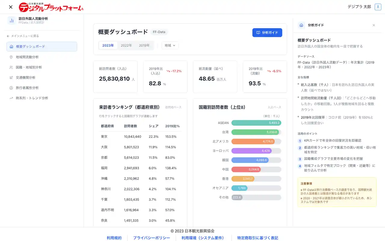 国土交通省が公表するFF-Data(外国人流動データ)と法務省の出入国管理統計という2つの公的統計を組み合わせ、訪日外国人の動態を6つの分析ビューで可視化します。 |