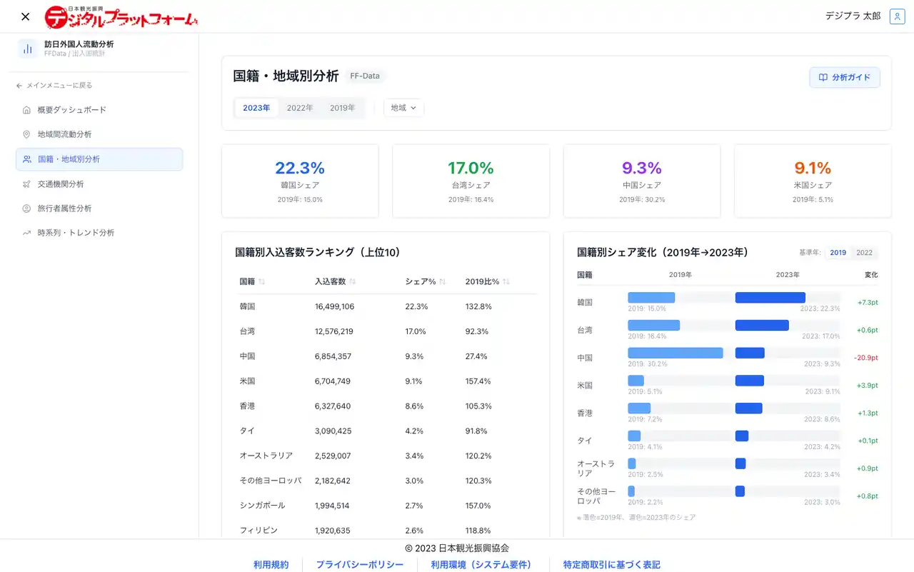 都道府県観光課担当者: 自県への訪日客の国籍構成と交通機関別流動を把握し、次年度のインバウンドプロモーション計画の根拠データとして活用いただけます。 |