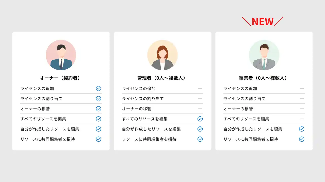 今回のリリースにより、ユーザーライセンスは「オーナー」「管理者」「編集者」の3種類となりました。 |