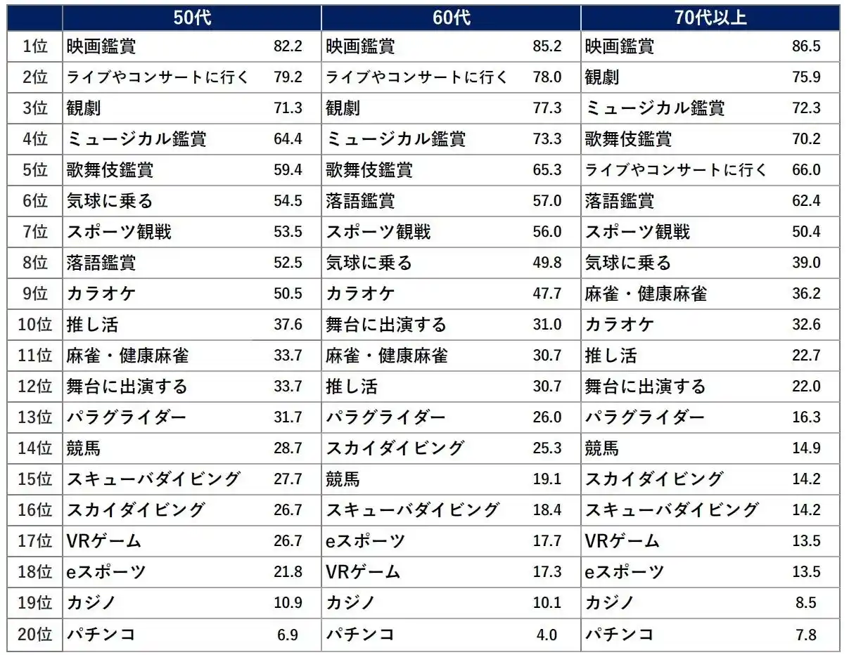 長く社会や家庭の役割を担ってきた世代だからこそ、今は「好きかどうか」で娯楽を選ぶ時期に入ったとも言えそうです。これまで忙しく過ごしてきた時間が少しほどけた今、「大きな挑戦」よりも「無理なく楽しめる新しい体験」が魅力に映っているのでしょう。実際、72.3%が挑戦したい娯楽があると答えました。挑戦とは必ずしも勇気のいる冒険ではなく、小さな非日常を生活に差し込むこと。そんな等身大の前向きさが、この世代の新しい余暇の姿なのかもしれません。 |