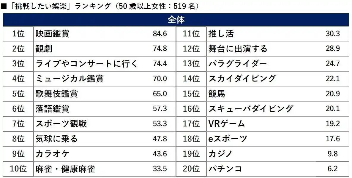 セカンドステージに入る50代以上の女性は、どんな娯楽に関心を持っているのでしょうか。調査してみると、いわゆる冒険型の挑戦とは少し違う姿が浮かび上がりました。 |