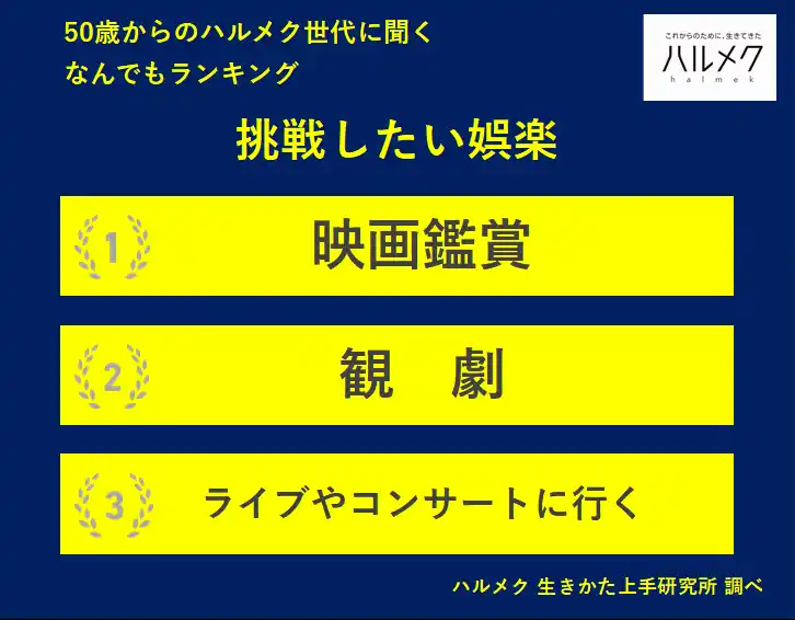 販売部数No.1(※1)雑誌「ハルメク」などのマーケティングやリサーチのコンサルティングを通じて、50代以上のインサイトを日々探求する「ハルメク 生きかた上手研究所」は、50歳以上の女性(事前調査588名、本調査519名)へのアンケート結果をもとにした「50歳からのハルメク世代に聞く なんでもランキング」を公開しました。テーマは「挑戦したい娯楽」です。 |