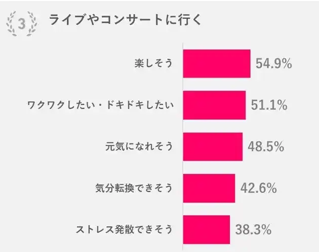3位は「ライブやコンサートに行く」。50代・60代で2位、70代以上では5位。挑戦したい理由の1位は「楽しそう」、2位は「ワクワクしたい・ドキドキしたい」、3位は「元気になれそう」。 |