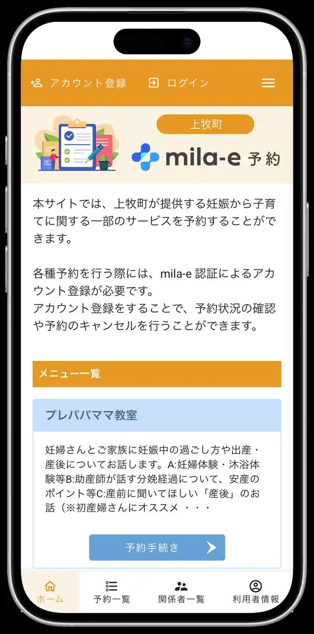 「上牧町 かんまき子育て応援アプリ」TOP画面の「mila-e 予約」バナーからアクセス後、mila-e 認証アカウントにてログイン、利用者情報を入力し予約を行ってください。 |