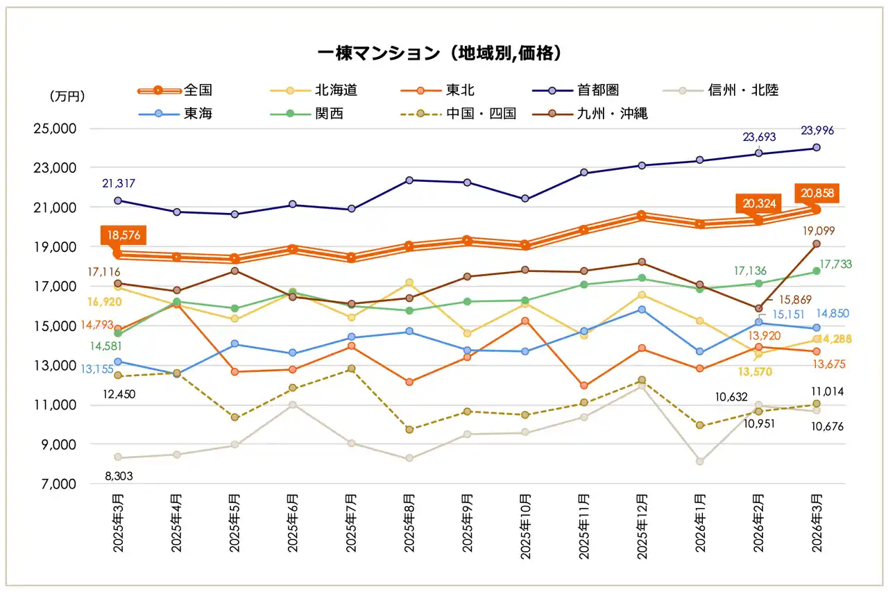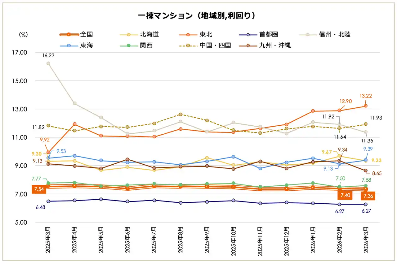 2026年3月期の一棟マンション市場は、全国平均価格が20,858万円で、2008年4月の集計開始以降の最高値を更新。前月比+2.63%、前年同月比では+12.28%となりました。全国平均利回りは7.36%で、前月比-0.04ポイント、前年同月比-0.18ポイントとなっています。 |