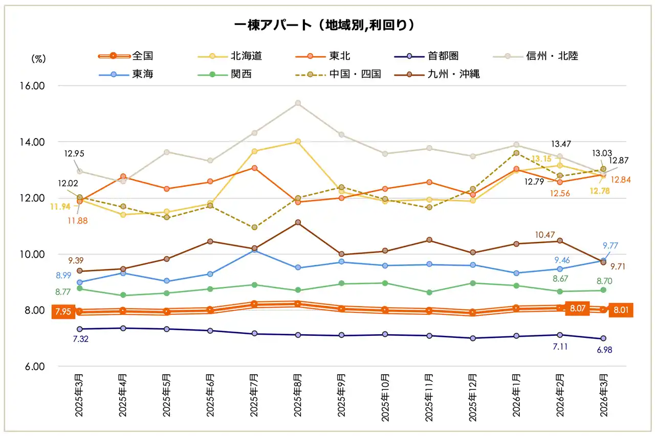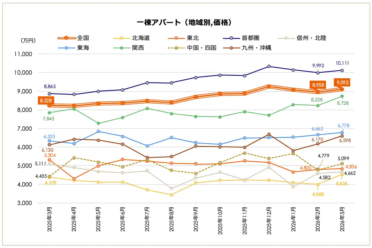2026年3月期の一棟アパート市場は、全国平均価格が9,092万円で、2008年4月の集計開始以降、2番目に高い数字となりました。前月比では+1.50%、前年同月比では+10.50%となっています。全国平均利回りは8.01%で、前月比では-0.06ポイント、前年同月比では+0.06ポイントでした。 |
