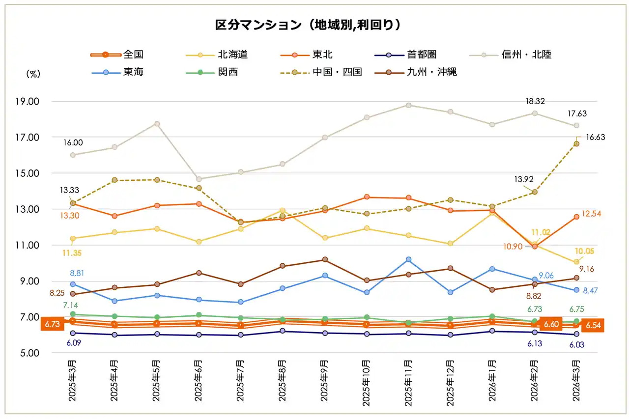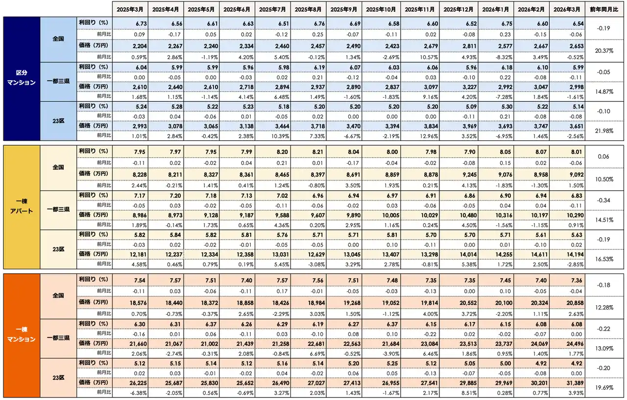 2026年3月期の区分マンション市場は、全国平均価格が2,653万円で、前月比では-0.52%、前年同月比では+20.37%となりました。前月比ではマイナスとなりましたが、全体としては値上がり傾向が続いています。全国平均利回りは6.54%で、前月比では-0.06ポイント、前年同月比では-0.19ポイントとなりました。 |