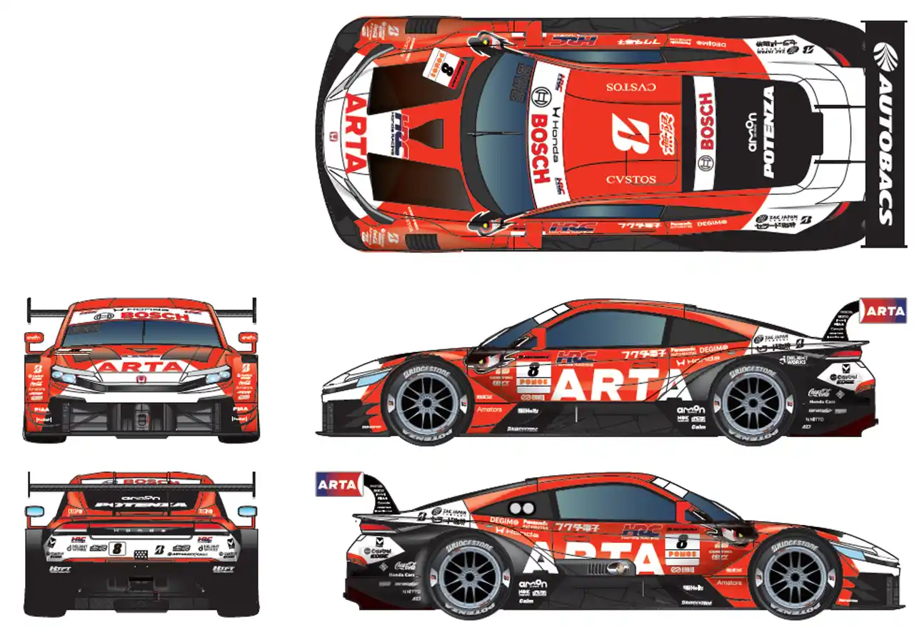 ARTAの象徴であるARTAオレンジを基調に、HRCのレーシングスピリットを重ねたカラーリングを採用。円弧モチーフや横断的に走るオレンジのストロークが、サーキットでひと目でARTAと分かる強い存在感を放ちます。 |