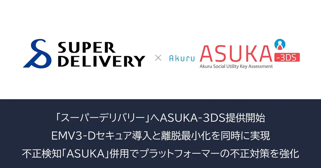 クレジットカード決済などの不正利用対策ソリューションを提供する株式会社アクル(本社:東京都港区、代表取締役社長:近藤 修、以下「アクル」)は、株式会社ラクーンコマース(本社:東京都中央区、代表取締役社長:和久井 岳、以下「ラクーンコマース」)が運営する卸・仕入れサイト「スーパーデリバリー」へ「ASUKA」および「ASUKA-3DS」の提供を開始しました。