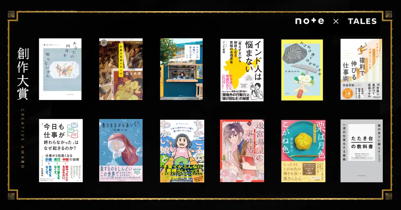 | 未来のスターとなるクリエイターを発掘する、noteとTALESが共同主催する日本最大級の創作コンテストです。これまで累計173,387作品の応募があり、書籍化・映像化・連載・舞台化など32作品のメディア化を実現しました。クリエイターと多数のメディアが一堂に会する、プロデビューへの登竜門です。 | ||||||||||||