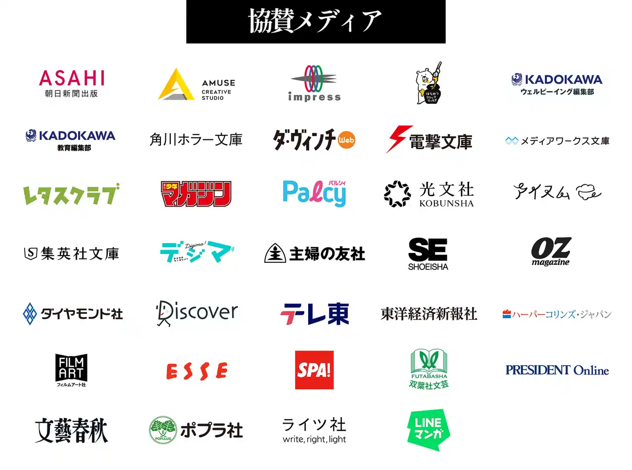 | 朝日新聞出版、アミューズクリエイティブスタジオ、インプレス、はちみつコミックエッセイ(オーバーラップ)、KADOKAWAウェルビーイング編集部、KADOKAWA教育編集部、角川ホラー文庫(KADOKAWA)、ダ・ヴィンチWeb(KADOKAWA)、電撃文庫(KADOKAWA)、メディアワークス文庫(KADOKAWA)、レタスクラブ(KADOKAWA LifeDesign)、週刊少年マガジン編集部(講談社)、Palcy(講談社)、光文社、アイスム(サクシード)、集英社文庫(集英社)、デジタルマーガレット編集部(集英社)、主婦の友社、翔泳社、OZmagazine/OZcomics/OZbooks(スターツ出版)、ダイヤモンド社、ディスカヴァー・トゥエンティワン、テレビ東京、東洋経済新報社、ハーパーコリンズ・ジャパン、フィルムアート社、ESSE(扶桑社)、SPA!(扶桑社)、双葉社文芸出版部、プレジデントオンライン(プレジデント社)、文藝春秋、ポプラ社一般書編集部、ライツ社、LINEマンガ(LINE Digital Frontier) | ||||||||||||