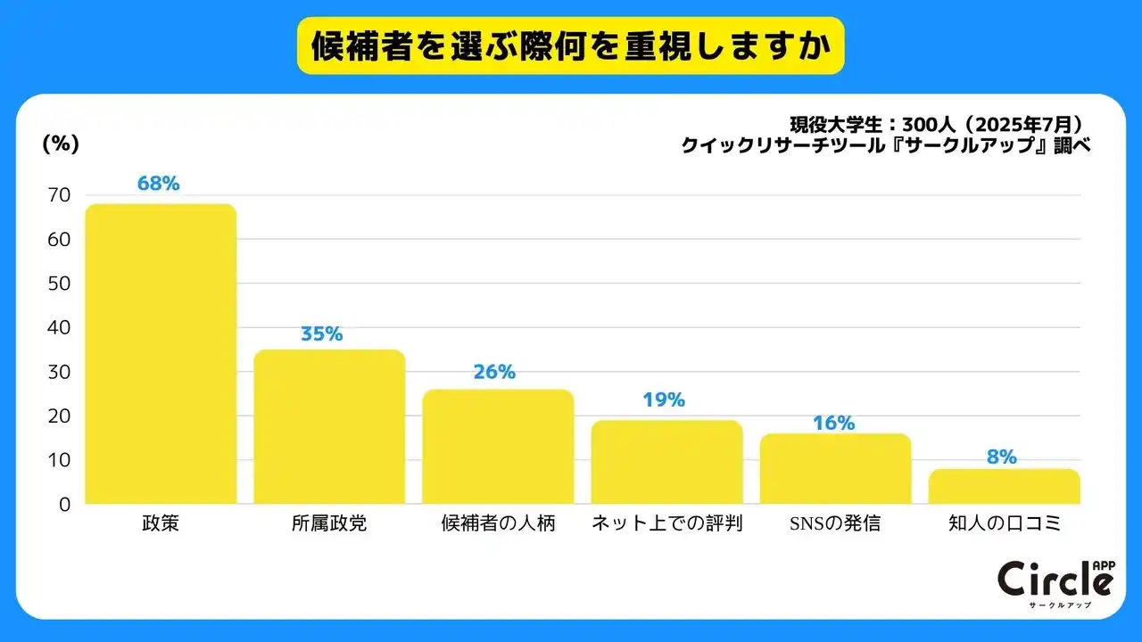 候補者や政党を選ぶ際に重視するポイントについては、「政策」が68%と最も多く、「所属政党」が35%、「候補者の人柄」が26%と続きました。 |