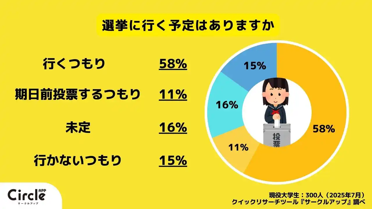 次に投票意欲について尋ねたところ、「投票に行くつもり」と答えた学生は58%、「期日前投票を予定している」が11%、「未定」は16%でした。 |