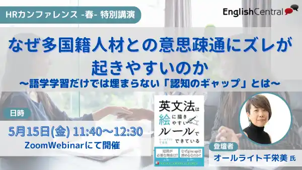 オンラインで英語を話せるようになるためのトレーニングを行うことができる『EnglishCentral』を企業・学校法人向けに提供する株式会社EnglishCentral Japan (本社:東京都台東区、代表取締役: アラン シュワルツ、以下、イングリッシュセントラル)は、2026年5月15日(金)に開催される日本の人事部主催「HRカンファレンス2026-春-」にて、言語、異文化コミュニケーションコンサルタントのオールライト 千栄美氏をお招きして講演を行います。本講演では、企業内多国籍人材の採用が進む中で、日本固有の人事制度、独特な商習慣、言語力の壁だけでは説明できない、コミュニケーションの課題について言語認知の観点から解説をいたします。