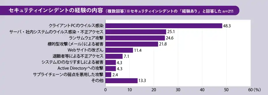 | この結果から、セキュリティ対策の重要性が経営・現場の共通認識として定着しつつあることがうかがえます。セキュリティインシデントの経験内容では、ランサムウェアやクライアントPCのウイルス感染に加え、「その他」ではビジネスメール詐欺なども挙げられました。特定の攻撃手法に限らず、リスクが分散・多様化している点が今回の調査の特徴です。 | ||||||||||||||||