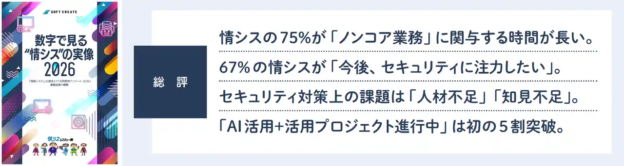 | 株式会社ソフトクリエイト(本社:東京都渋谷区/代表取締役社長:林 宗治、以下 ソフトクリエイト)は、情報システム部門の現状を把握するため、「情報システムの現状とIT活用実態アンケート 2026」を実施しました。本調査は第8回目となり、情報システム部門向けメディア「情シスレスキュー隊」で調査結果を公開しました。 | ||||||||||||||||