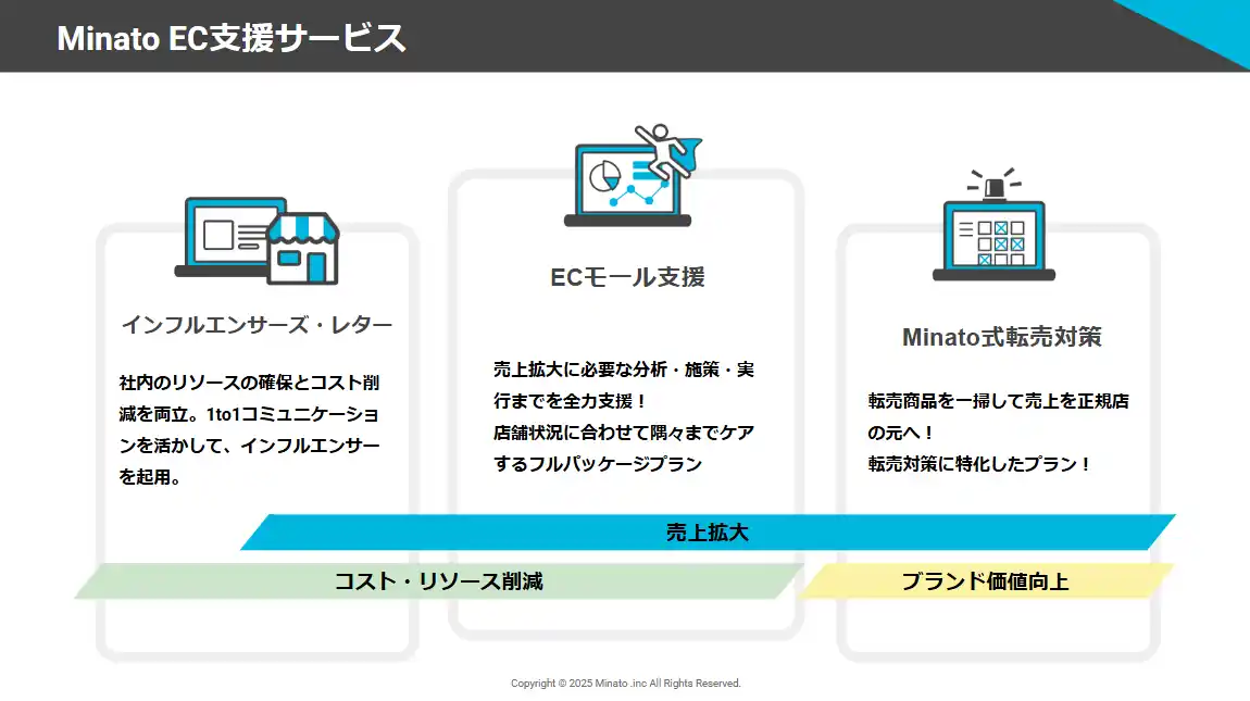 『面白そうな領域になんでも首を突っ込む』をミッションにデジタルマーケティングの力でクライアントの商品を世に広めるデジタルマーケティング支援事業を行っております。ECモールコンサル支援に強みを持ち販促を強化したい企業に対して広告支援や検索対策、転売対策や顧客・市場データの分析など幅広く展開しています。シナジーのある企業との連携を軸にMinato × パートナー企業で新しい価値を生み出します。 |